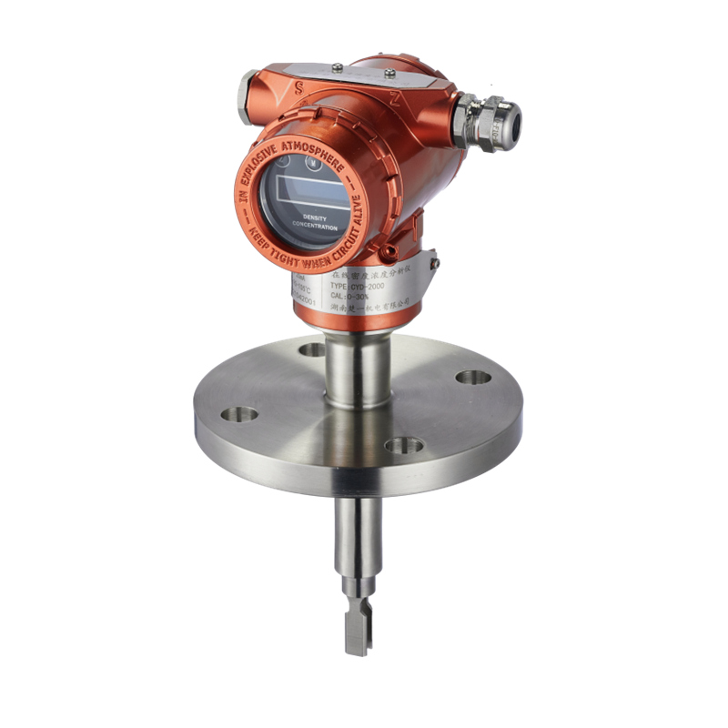 在線密度/濃度計,是使用聲波頻率信號源對金屬音叉進行激勵,并使音叉處于中心頻率下自由振動,此頻率與接觸液體的密度有著相聯(lián)對應(yīng)關(guān)系,因而通過對頻率的分析可測量液體的密度,再進行溫補可消除系統(tǒng)的溫漂;而濃度則根據(jù)對應(yīng)液體密度和濃度的關(guān)系式可計算出25℃溫度下的濃度值。